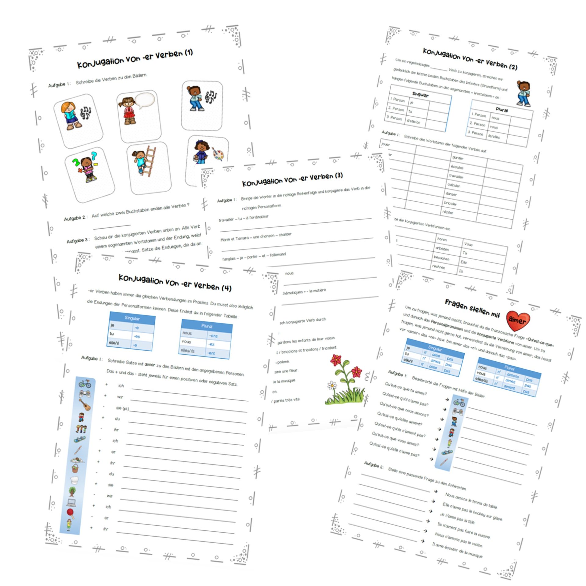 Enthalten sind Arbeitsblätter zu den -er Verben, ein interaktives PDF zum Üben der -er Verben sowie der drei wichtigen Verben être, avoir und faire, Tafelmaterial und 4 verschiedene Dominos zur Konjugation von -er Verben: